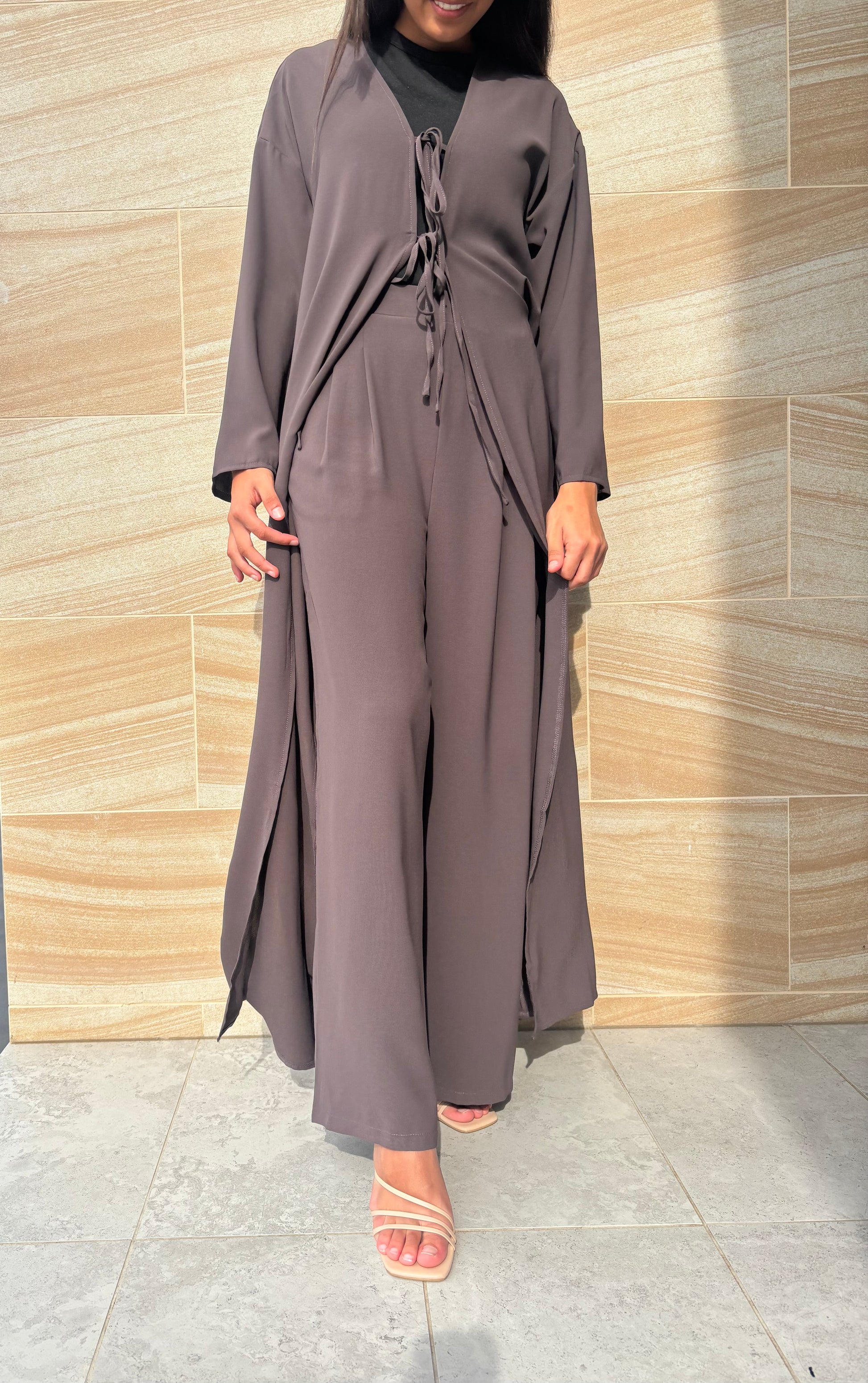 The Amira Pants Suit in elegant brown hues is perfect for any smart casual occasion. The long jacket and tailored pants provide a classic, sophisticated look. Upgrade your wardrobe with this stylish, versatile outfit.