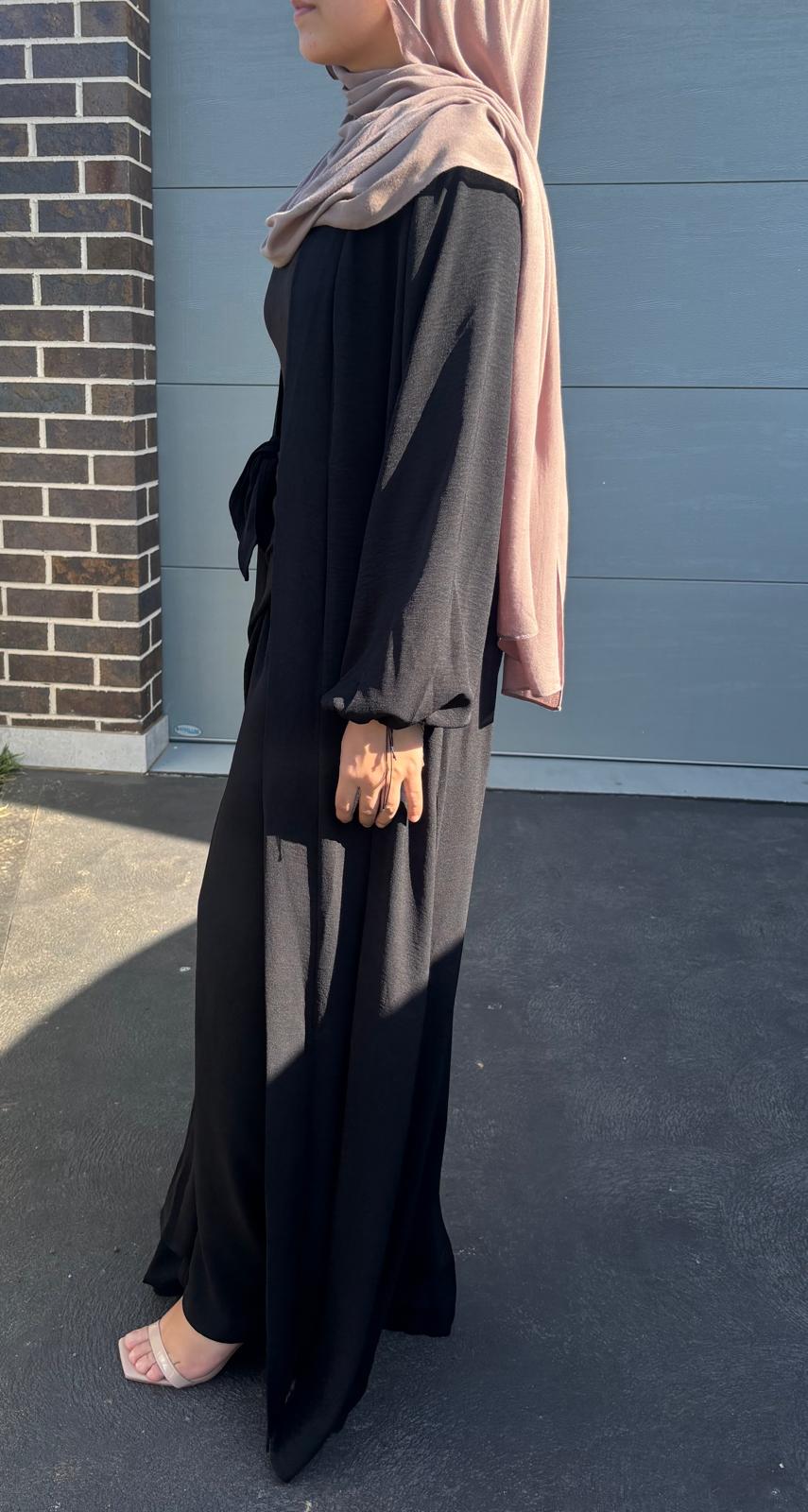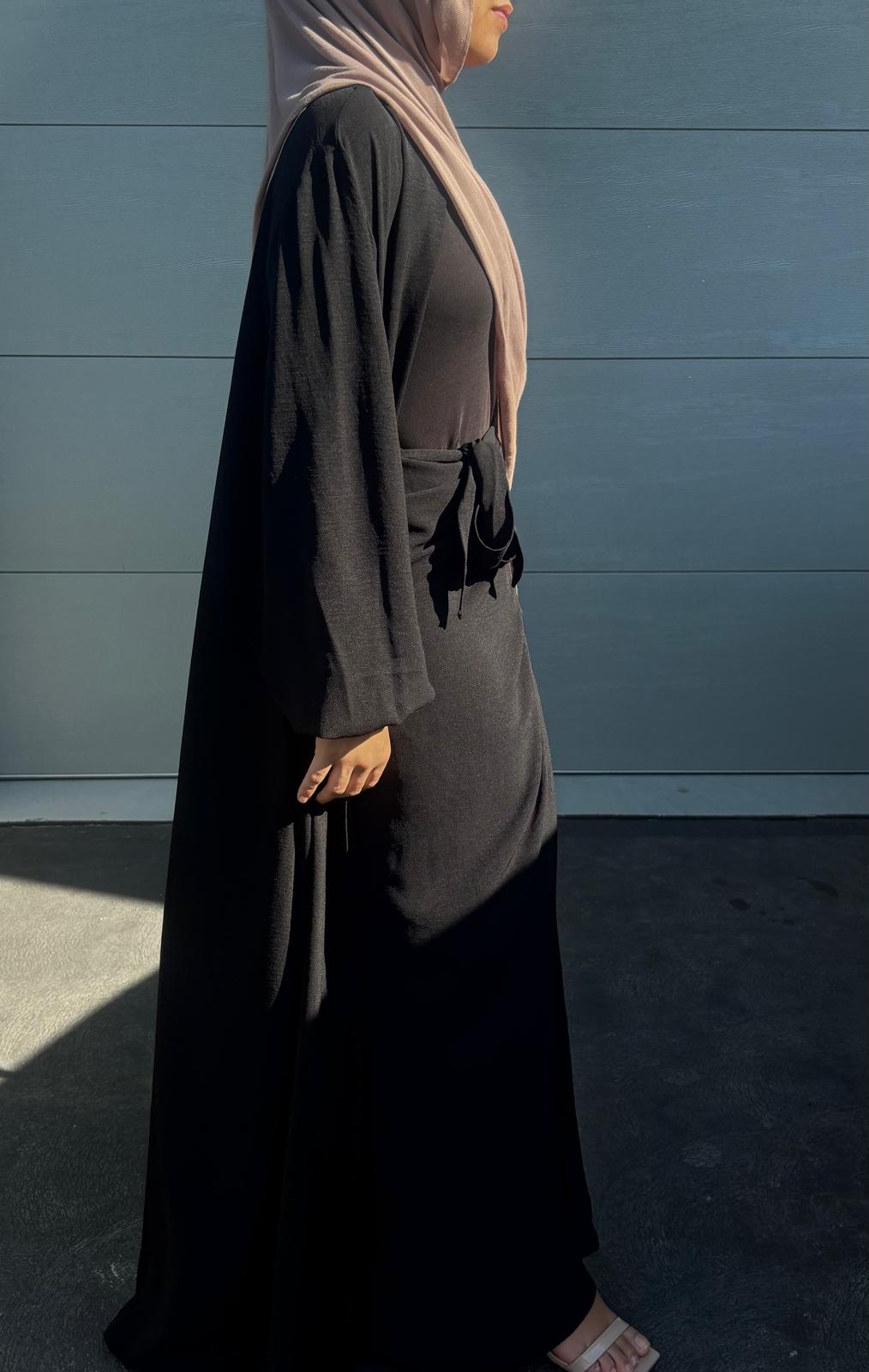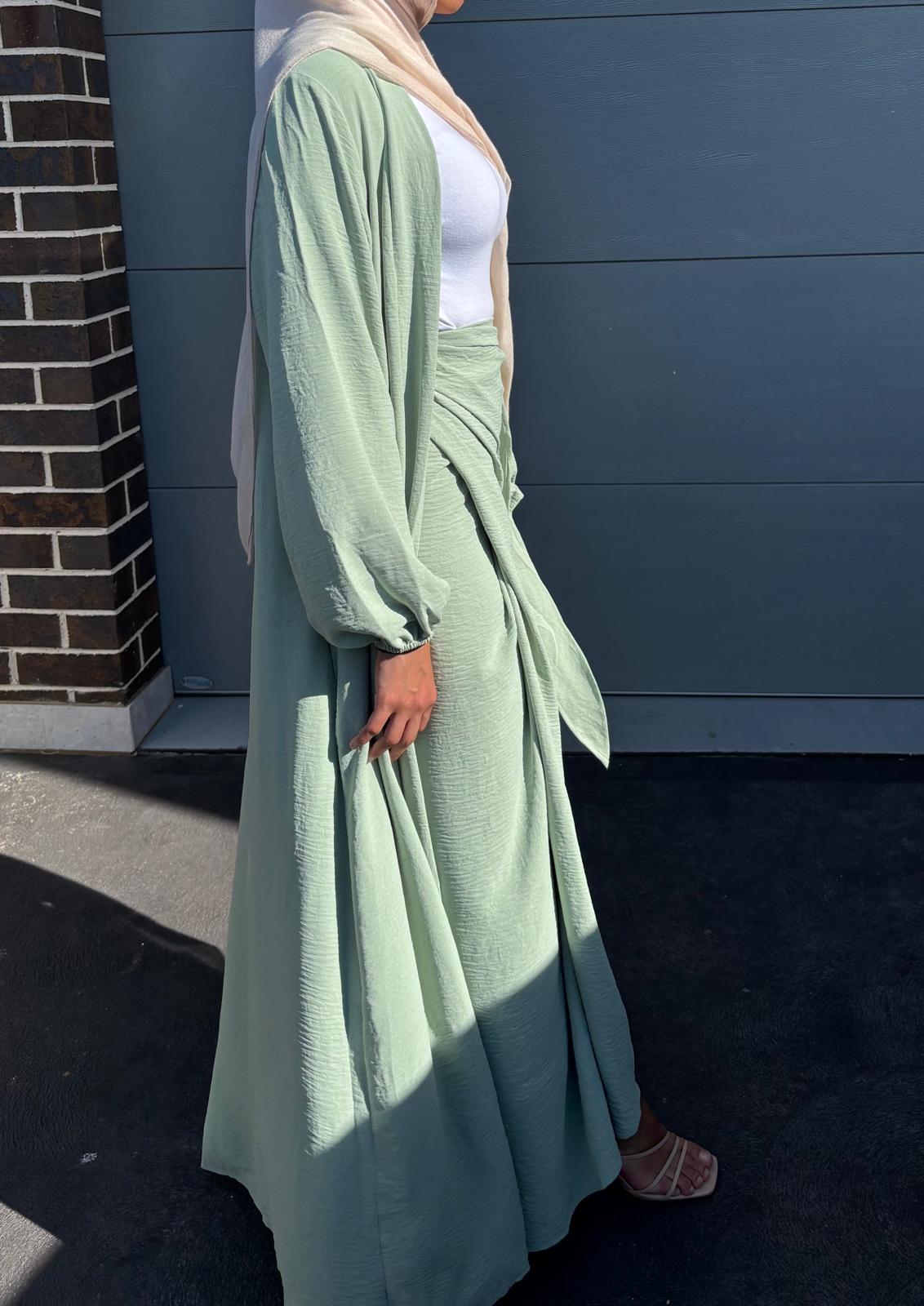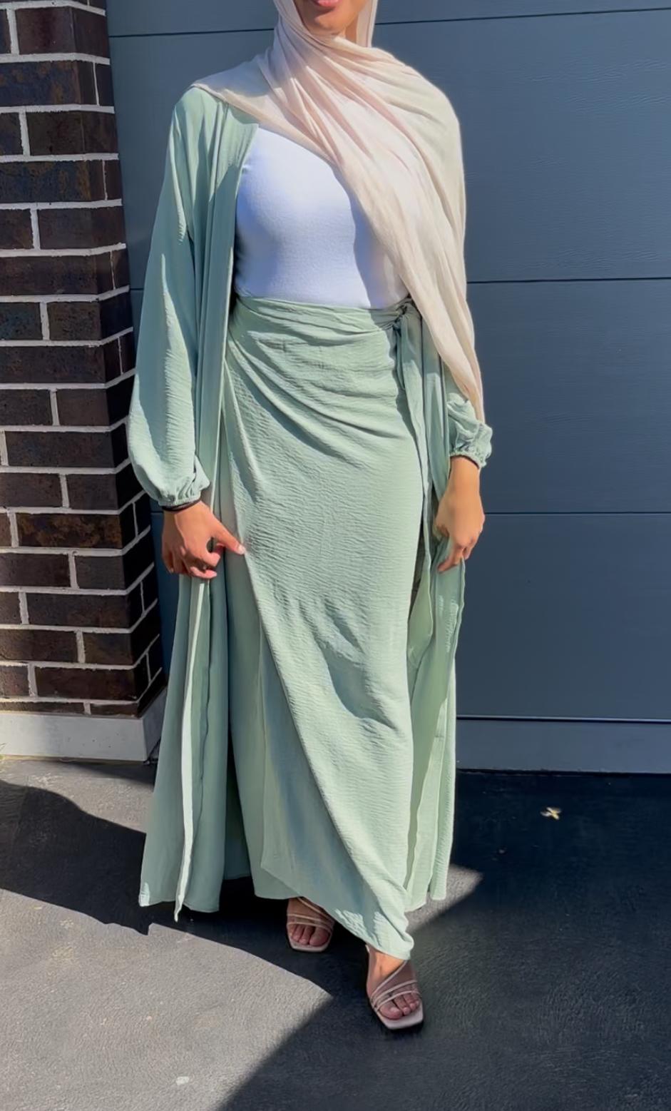 The Layla Set is a timeless and elegant ensemble designed for effortless sophistication. Featuring a flowy, full-length wrap skirt with a flattering draped detail, this set exudes grace and movement while offering an adjustable fit for comfort. The matching open abaya-style cardigan adds a modest yet stylish layer, making it perfect for both casual and formal occasions. Crafted from a lightweight, textured fabric, it provides a soft, breathable feel while maintaining a luxurious look. Paired with a simple top and delicate sandals, this set is a versatile staple for any wardrobe, offering both comfort and understated elegance.