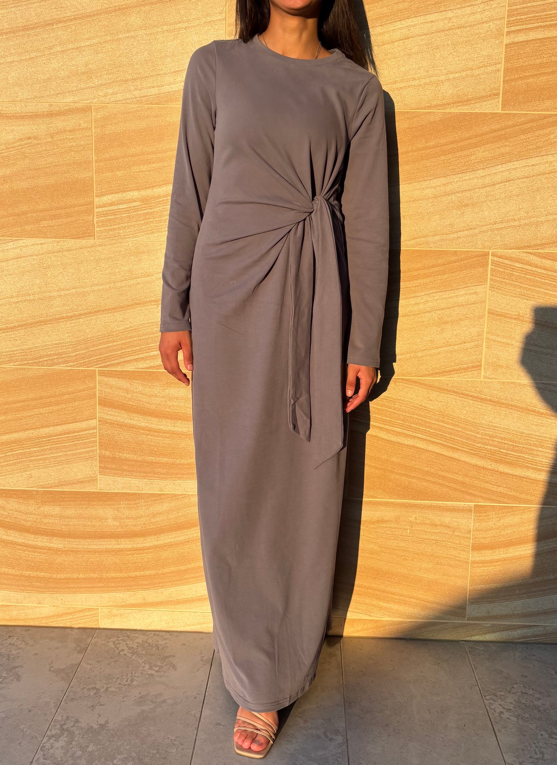 Elevate your everyday elegance with this minimalist maxi dress, designed with a graceful side-knot detail. Crafted from soft, breathable fabric, this long-sleeve dress features a simple yet flattering silhouette that drapes naturally along the body. The side knot cinches the waist subtly while maintaining a modest and refined look.