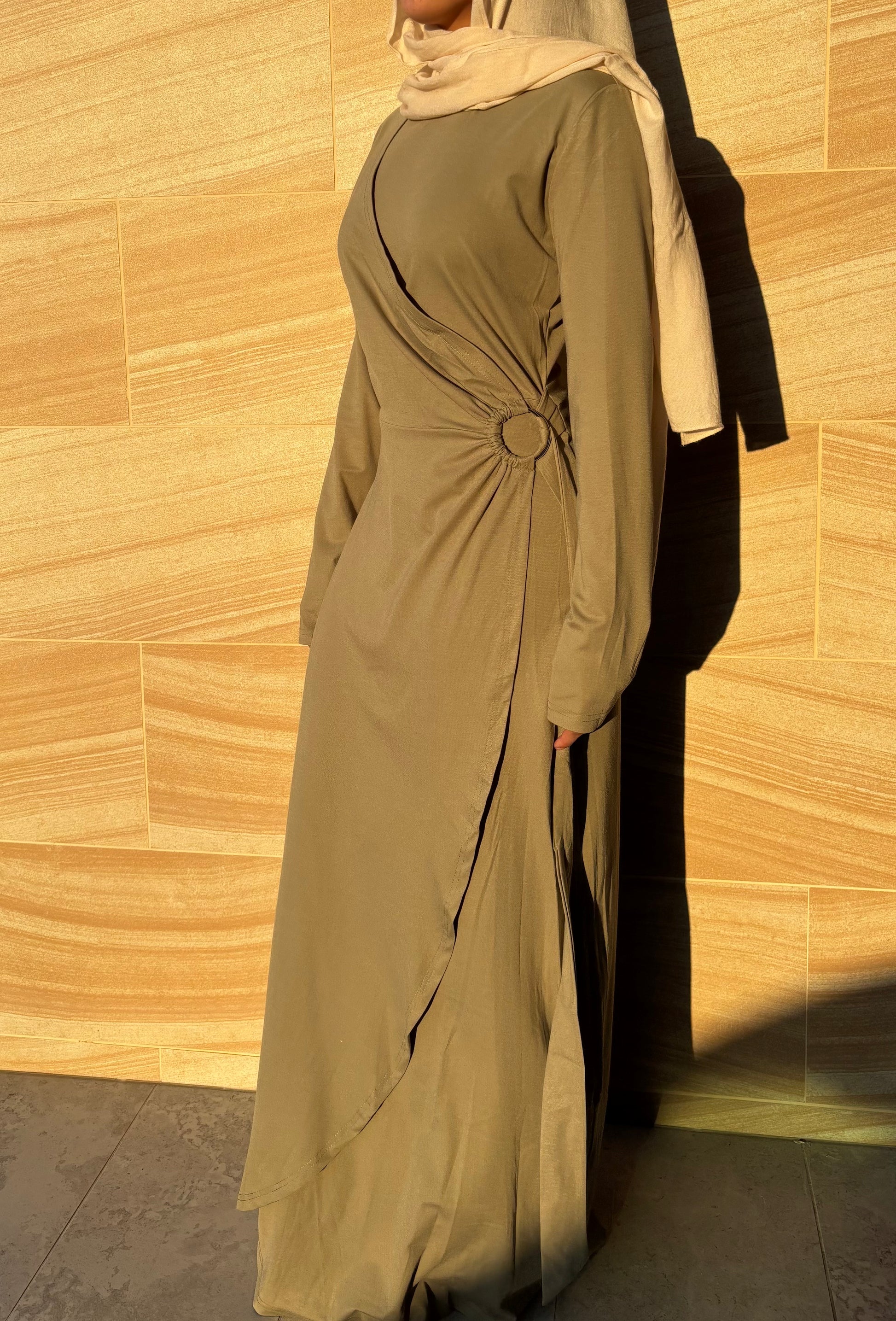 Step into timeless elegance with this sophisticated khaki wrap maxi dress. Designed for modesty and grace, this long-sleeve dress features a unique side ring detail that gathers the fabric at the waist, creating a flattering silhouette. The soft, flowing fabric drapes beautifully, while the asymmetrical overlay adds a modern touch to this classic style.
